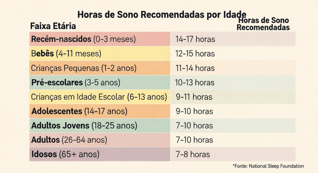 Primeiro, é crucial definir o que é “dormir demais”. A necessidade de sono varia ao longo da vida. Segundo a National Sleep Foundation dos EUA, as recomendações são: