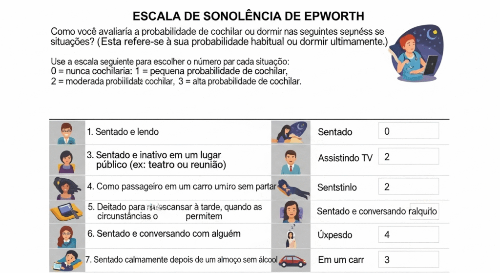 Esta é uma ferramenta de triagem simples e validada, usada por médicos em todo o mundo. Responda à pergunta: “Qual a probabilidade de você cochilar nas seguintes situações?”.